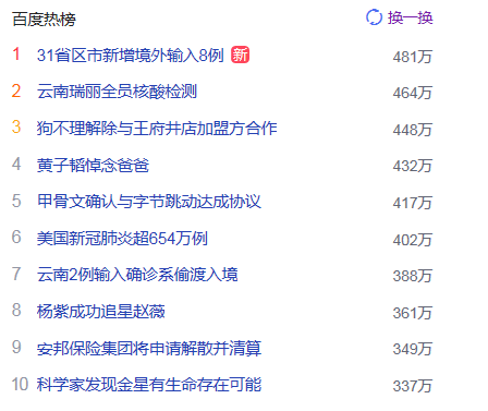 2.云南瑞麗全員核酸檢測(cè) 獵頭熱點(diǎn)熱度464萬